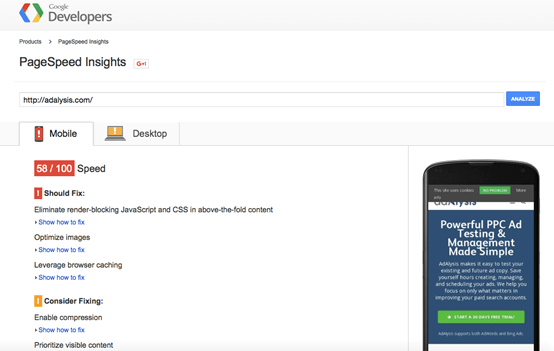 Step 2. If your landing page load time is slow, then use Google page load insights tool that makes suggestions on improving your landing page speed that you can use here, for both mobile and desktop devices.