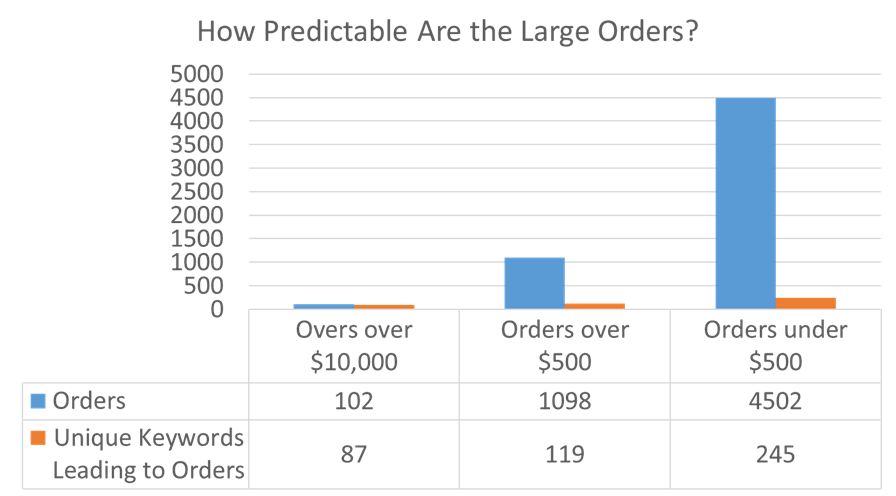 For orders under $500, their 4502 orders came from only 245 keywords; meaning small sales are somewhat predictable.