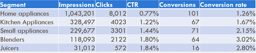 For example, in the test for blenders and juicers, you can see at the level of ‘juicer’ there was no longer an advantage of continuing to segment the site as the impressions dropped significantly and the conversion rate, CTR, and CPI no longer drastically improved at that segment.