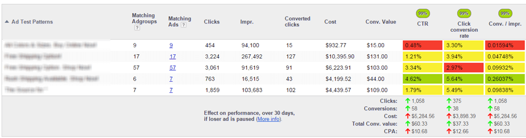 What we see is that the fourth line is the highest CTR, CPI, and Conversion rate. In fact, if the losing CTR ad didn’t run last month, these ads would have produced another 1,058 clicks and 58 more conversions.