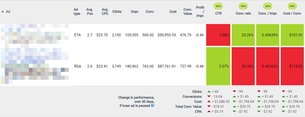 You can easily test RSAs vs ETAs by just putting both ad formats in an ad group. This is a very common ad test result when testing RSAs vs ETAs: