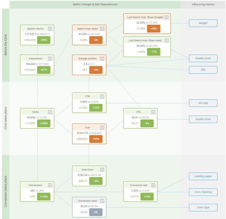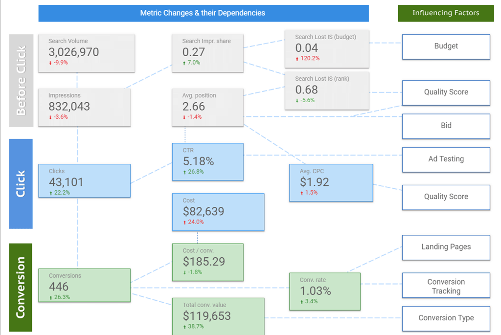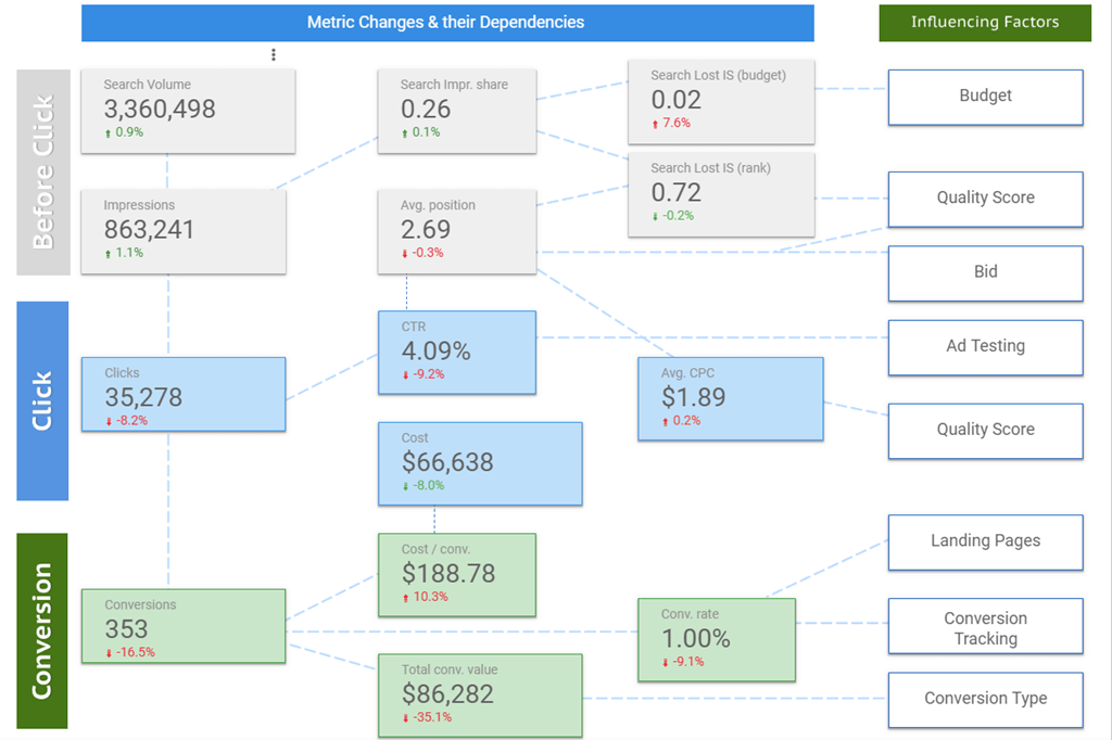 This report has so much data on it that we need to understand what affects search volume, CTR, conversions, and our other metrics. Once we understand all of these metrics, then the investigation can be swift and efficient so you can quickly put a fix into place. Adalysis is built so you can see at a glance what metrics changed and where.