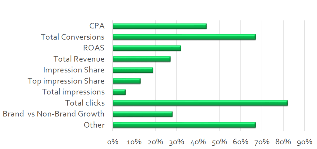We wanted to know what type of KPIs are most commonly monitored and were surprised to find that total clicks was the number one metric, which was closely followed by total conversions, ROAS and CPA. Some companies monitored both ROAS AND CPA, but the majority of companies only tracked CPA (lead gen) or ROAS (ecommerce).