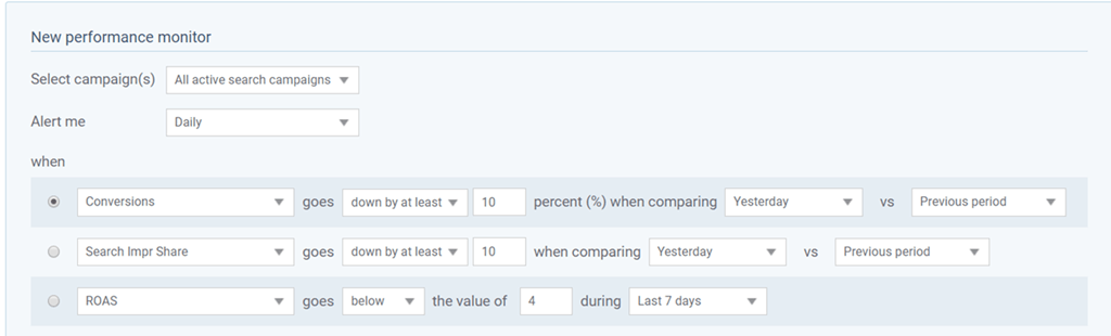 While you might only want to monitor quality scores monthly or quarterly, monitoring your ROAS or CPA on a monthly basis seems like a bad idea. It’s so easy to automate this data on a daily or weekly basis for alerts when something drops significantly or falls below your target threshold.