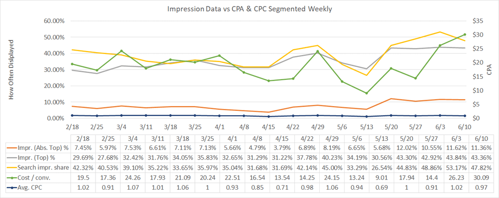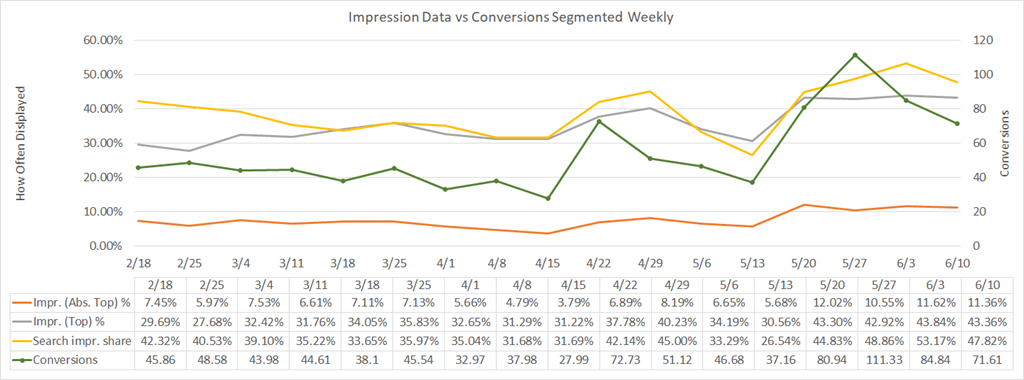 In this chart, we’ve added conversion data. Our secondary axis looks at the number of conversions we receive per week. We can see as the Search Impression Share and Impression Top % increases, our conversions follow. In this campaign, impression absolute top does not correspond that closely to conversions – it’s about being displayed (impression share) in the top (Impr (top %) positions.
