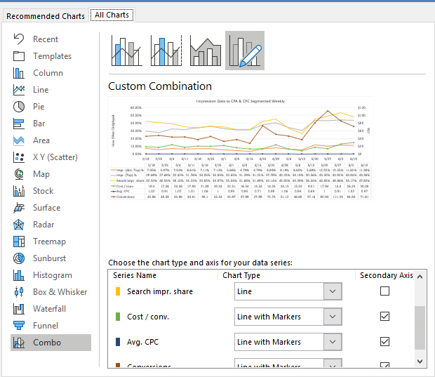 We can easily change the secondary axis to be another metric, such as cost, CPC, CPA, and so forth. In this chart, we just added CPA. The CPA is closely aligned with our impression share. In other words, as we increase our bids (CPC goes up), our impression share increases (which it should as our ad rank goes up) and our CPA also goes up, which is to be expected since our average CPC increased.