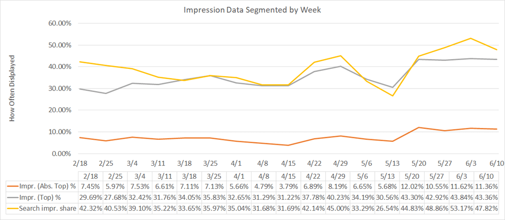 Please note impression share is useful to add to this type of data as that gives you an overall idea of how often you were displayed. To simplify the charts, it is useful to add just impression share to the rate numbers, so you have context for how often your ads did show and then look at how often they were top or absolute top when your ads were displayed.