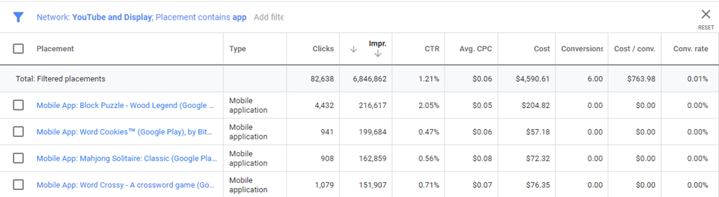 The reason most people want their ads off of apps is that apps rarely do well for advertisers. Just look at this account, there’s an app game with a 2.05% CTR. That’s a huge display CTR, and we’re pretty sure most of those clicks are accidental game clicks.