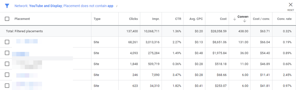 If you look at your placement data and find that apps aren’t doing well for you, then the best place to start blocking them is at the account level using the exclusions feature found under the placement. Once that is done, it is easy to then create a filter for app placements in your Where Ads Showed screen so you can quickly run the filter, select all, and keep blocking all of these apps.