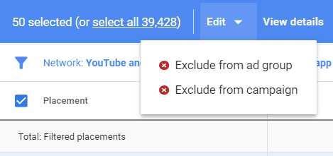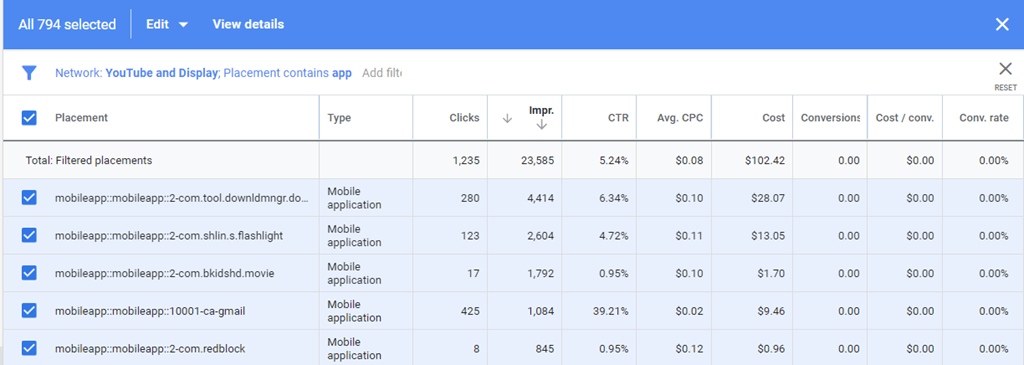 Even after excluding every app category, within 7 days, we were shown on another 794 different app placements. You can bulk select and exclude these at the campaign level (Google doesn’t support account level for this operation):