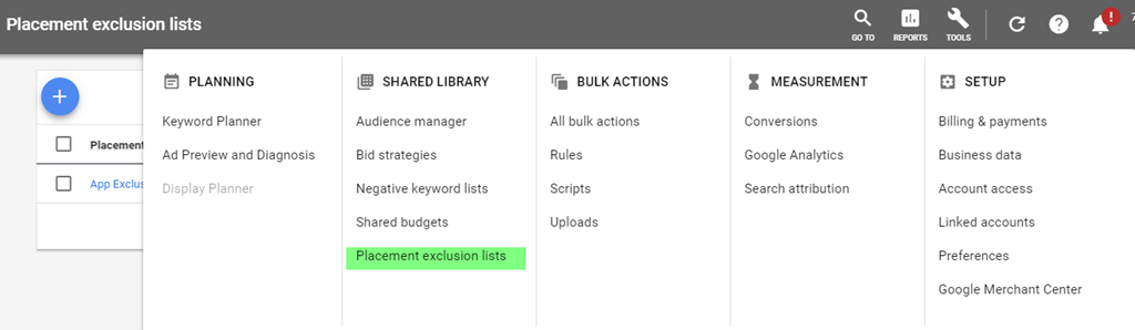 The second option is to navigate to the Placement Exclusions lists, which is found under tools.