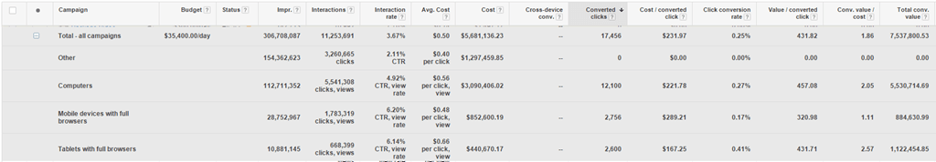 Your mobile CTR isn’t bad, but when you look at your cross device conversions; they are 0. And you know its working as you had 3 cross device conversions last month and have checked and double checked – they are really just 0.