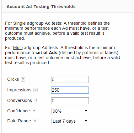 Some people like to also set minimum click numbers; but the one issue with setting minimum click numbers is that if you have an ad that is doing terrible then it might take a long time to hit your minimum click threshold, which means you’ll waste valuable impressions on this ad that is not receiving clicks, and therefore is not being removed from your account.
