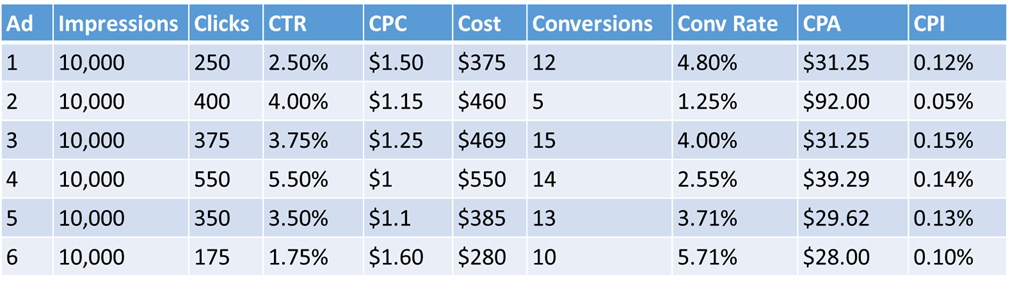 If we just want the most conversions possible; then ad 3 is our clear winner. It receives 15 conversions for every 10,000 impressions. This is why CPI is such as great metric. Ad 3 is not the winner in CTR (that’s ad 4) or the winner in conversion rate (that’s ad 6). In comparison to our other ads; ad 3 has both a good CTR and a good conversion rate, but it is not a winner or loser in either metric. However, when you use both CTR and Conversion rate to calculate the most conversions possible for and ad; then ad 3 is our clear winner.