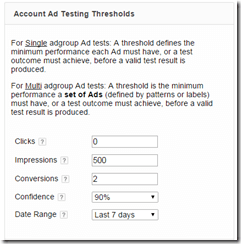 The primary number you want to set as your minimum is impressions. When an ad is displayed, then you have a chance at a click, cost, conversion, and a way of determining your CPA for each ad. If you have a very high volume ad group, you might set a very high minimum impressions (such as 1000). If you have medium volume ad groups; then you might only use 500 impressions. If you have low volume ad groups, then it is recommended that you use multi-ad group testing instead of A/B testing and can once again set higher thresholds.