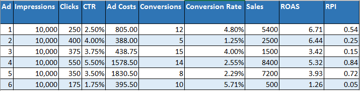 | Ad | Impressions | Conversions | Revenue | Average Sale Amount | RPI |