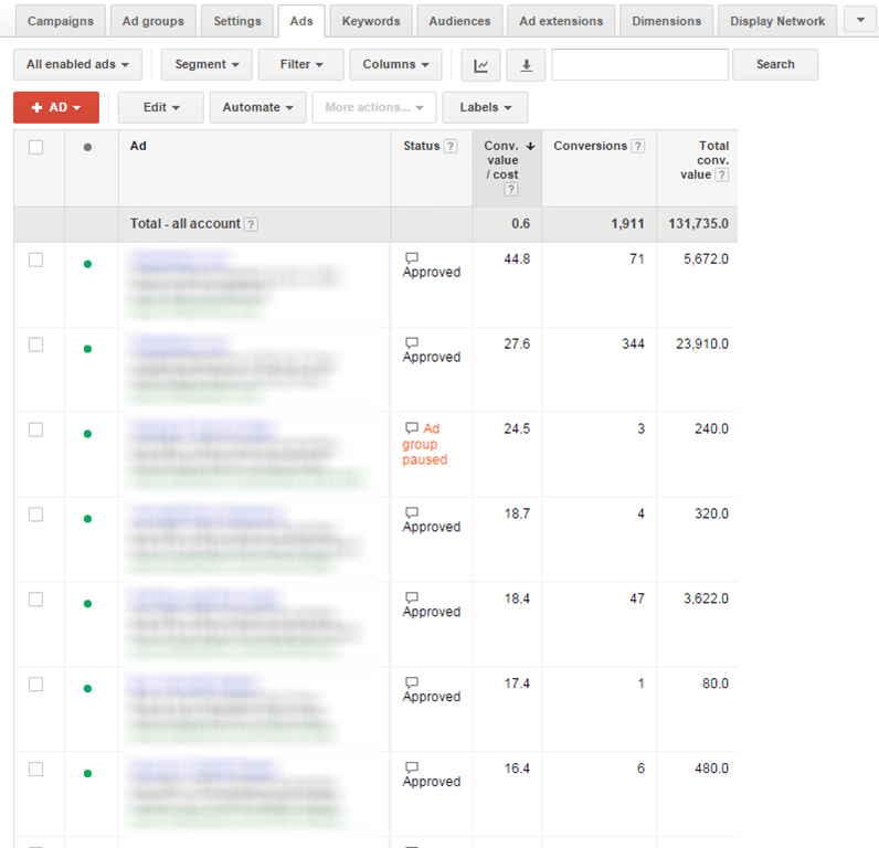 | Ad | Conversion Value | Cost | Conv. Value / Cost |