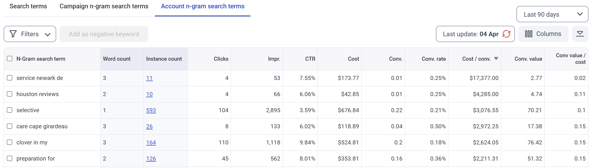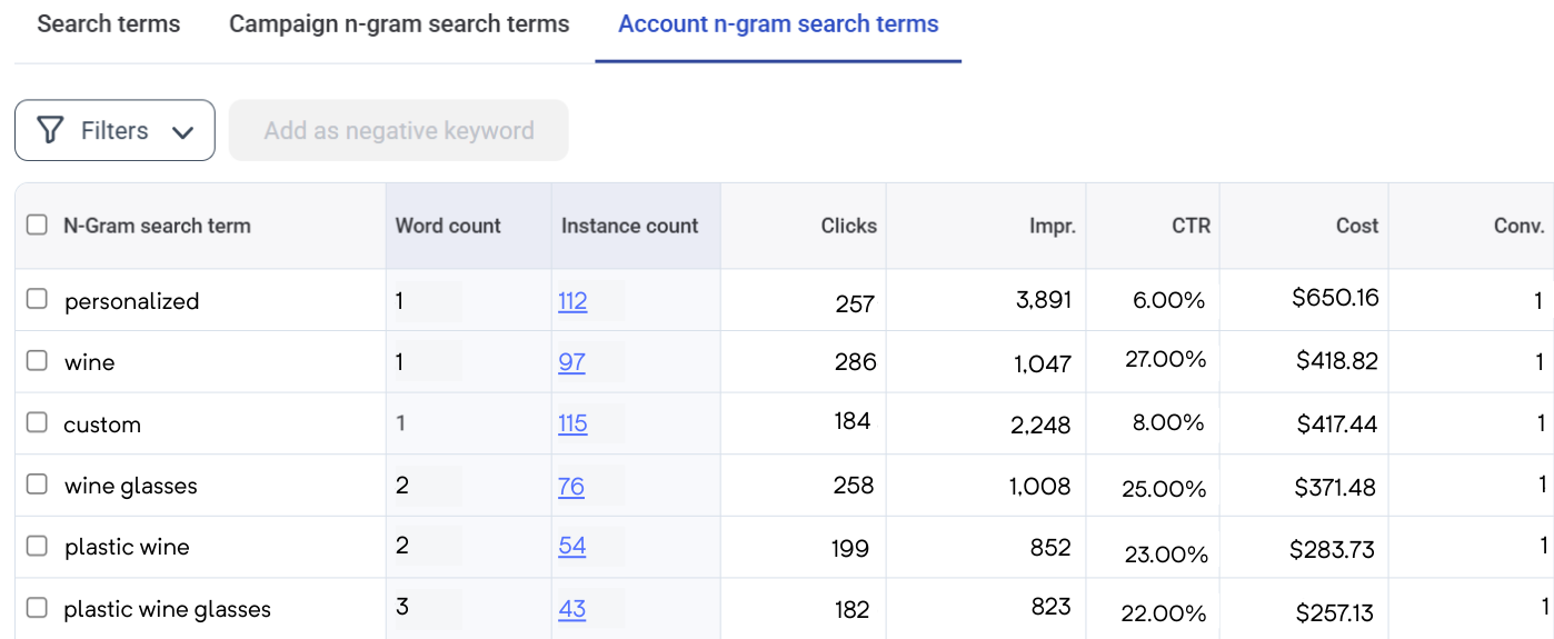 You can then sort by higher CPA or lower ROAS to find n-grams to evaluate.