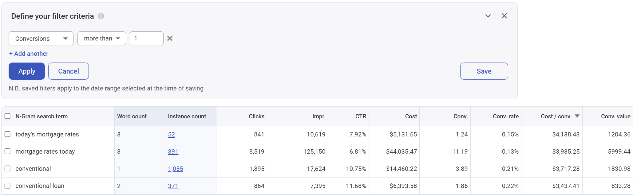 In our previous filters, we looked at n-grams with zero conversions. You’ll often have search terms that are converting, but at very high CPAs.