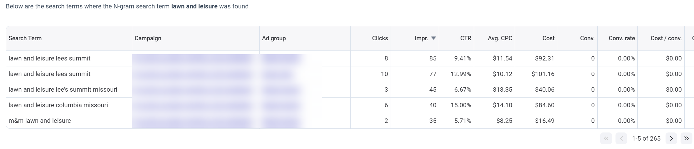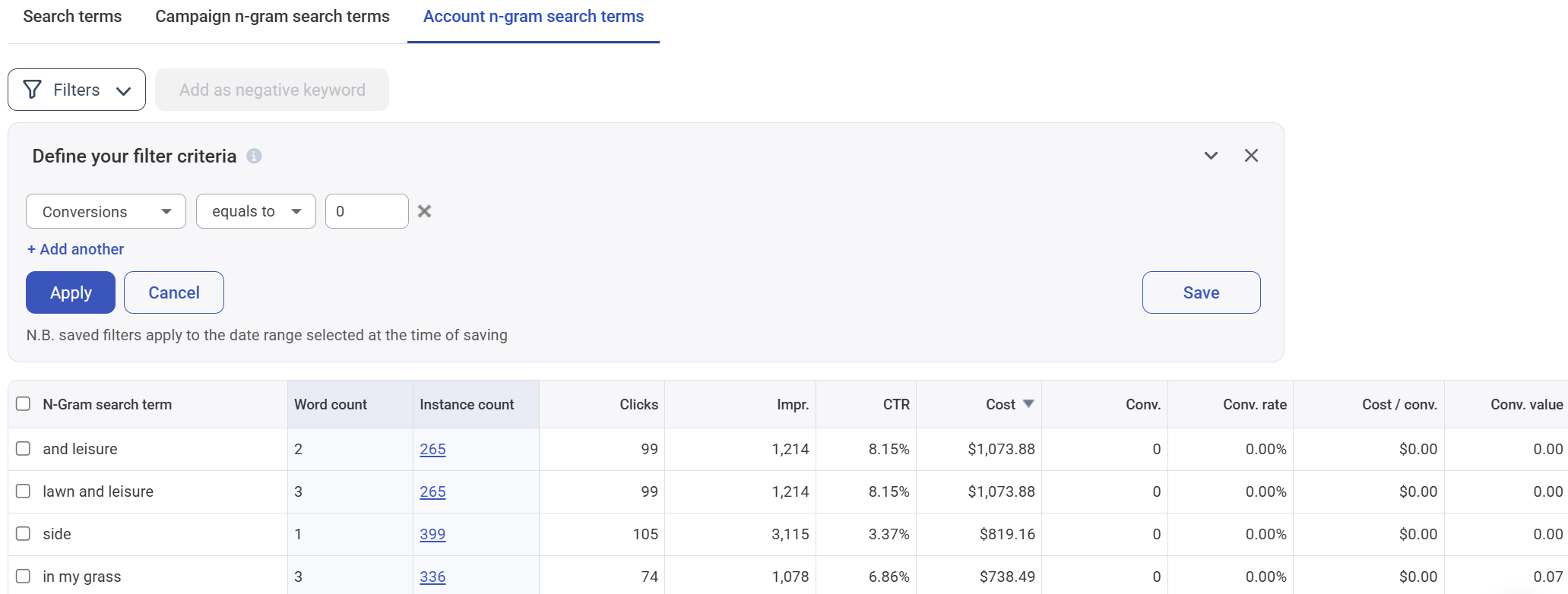 With n-grams, it becomes clear that search terms including ‘and leisure’ or ‘lawn and leisure’ have spent over $1,000, with zero conversions.