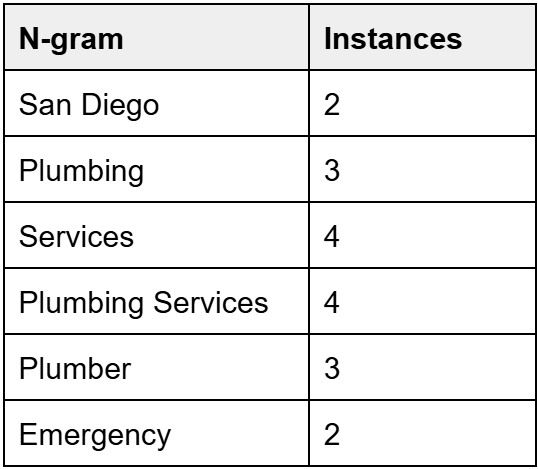 This is a sample of the above n-grams. In a full analysis, there would be more n-grams such as: San, Diego, in, number, phone, etc.