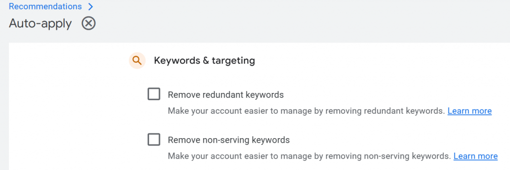 - Removing non-serving keywords — if a keyword doesn’t receive impressions in a while, then Google marks it as non-serving and recommends removal.