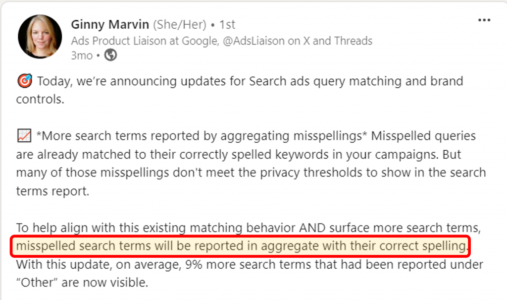 In June 2024, Google announced that they would combine misspellings with proper spellings in search terms reports.