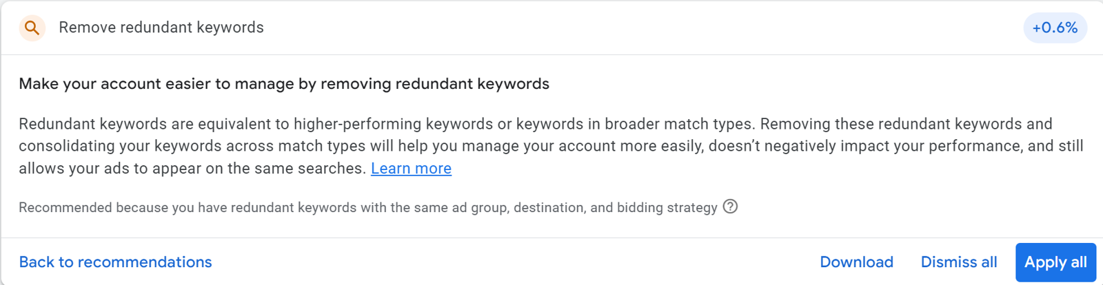 - Removing redundant keywords can cause ad-serving issues.