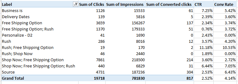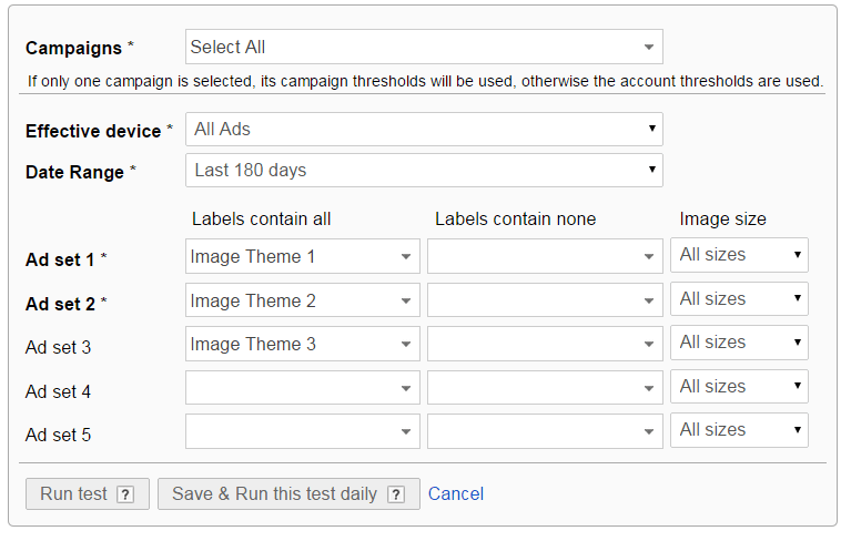 Note: If you are only using placement targeting (so that your ads are always on the same placements); then you will want to A/B test ads by size by ad group since the ad display is consistent. If you are using keywords, topics, remarketing ,etc as your targeting option where the placements are not consistent, then theme testing with labels is the way to start.