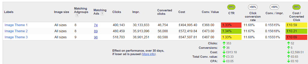 Regardless of which method you choose, you should start your image ad testing by first understanding how each theme does. Once you have a good idea of how to create your themes, then you can move to a more A/B testing approach for each ad group based upon how your are targeting your image ads across the display network.