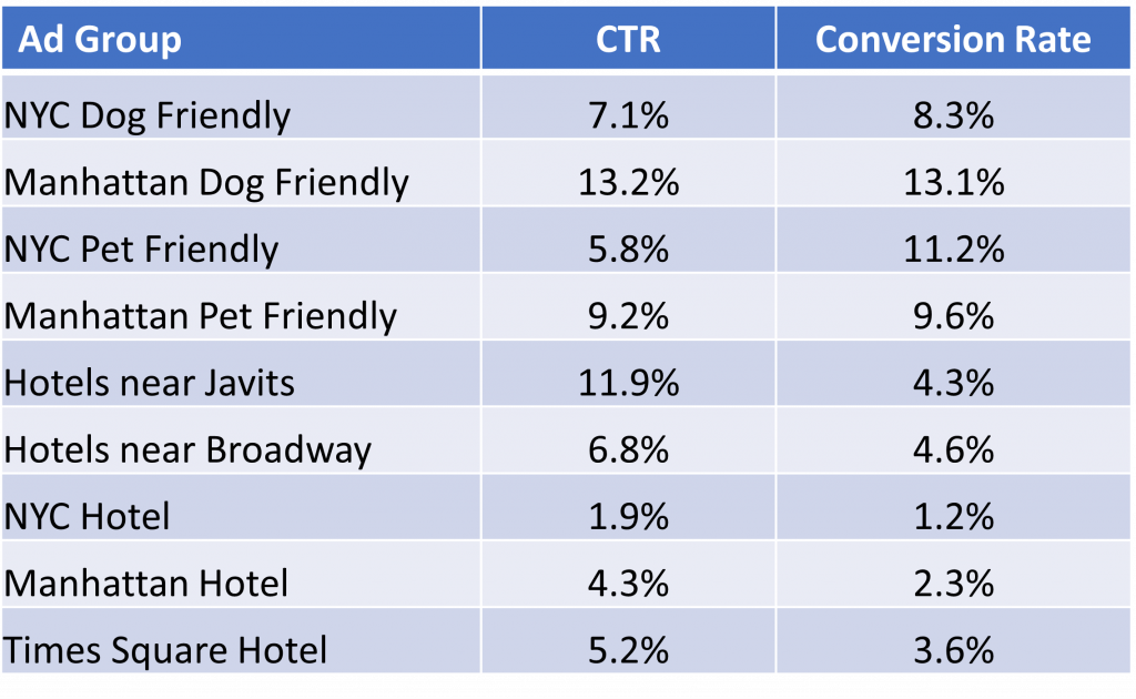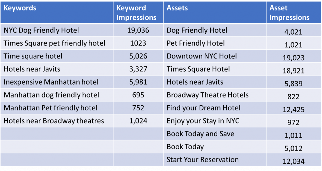 Unfortunately, that did not happen. Despite the NYC dog friendly hotel (their top converting keyword) keyword being by far their most searched for term, the dog friendly asset has less than 25% of the impressions compared to the keyword. In addition, that asset was also displayed with other keywords, such as Hotels Near Javits.
