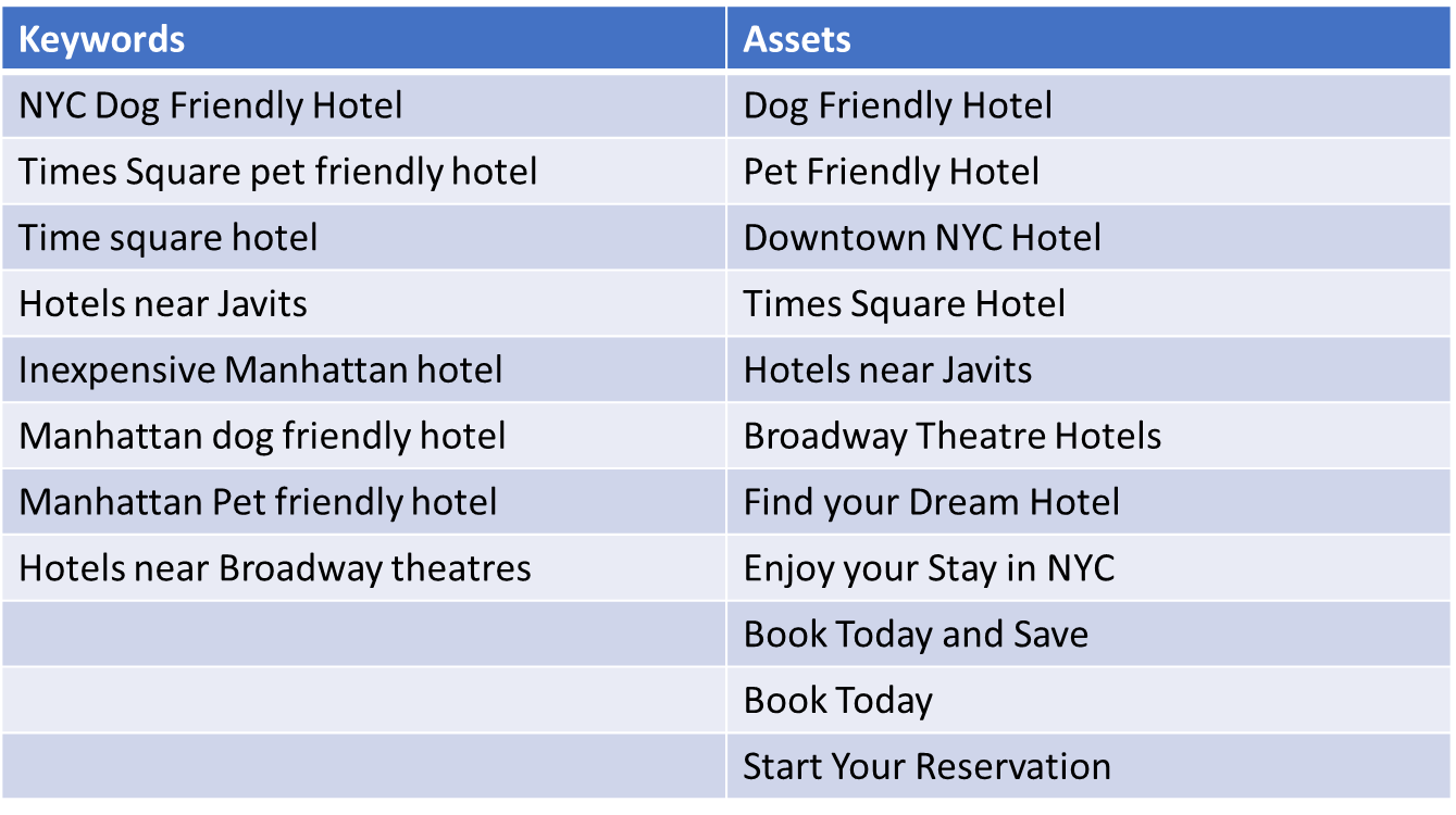 For example, here are the keywords and RSA assets in an ad group for a hotel based in New York City.