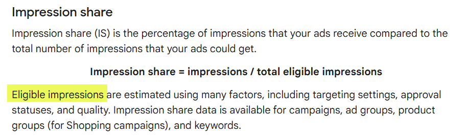 Impression share is the percentage of times your ad was displayed compared to how often it was eligible to be displayed. However, there are some important caveats to understand before interpreting this data. This information comes from Google’s impression share help files.