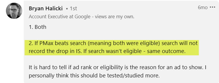 If PMax shows an ad over your Search campaign, then Search isn’t eligible for the auction. This was confirmed in a LinkedIn discussion with Google executive Bryan Halicki.