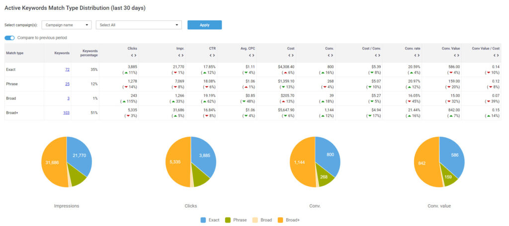 The second is a tool that allows you to see your data by match type distribution. This tool will let you see how each match type is performing, and compare time periods, to ensure you aren’t suddenly losing a lot of clicks, impressions, and conversions during the change.