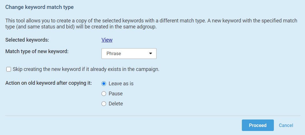 We’ve launched two new tools to help navigate the change. The first will let you quickly make copies of keywords and change their match types, along with some options on how to treat the old keywords. This will help you quickly move to phrase match.