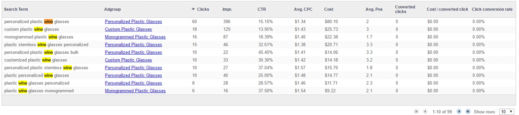 If we keep digging through high spend and low conversion words (filtering by words with less than two conversions and sorting cost from high to low), we see that the word ‘wine’ has appeared in 99 different queries. When it appears, there’s only one conversion at a very high CPA.