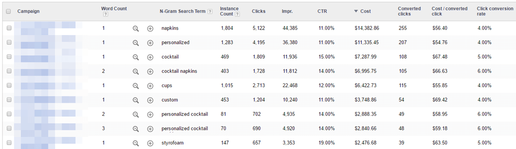 For instance, in this account, the word ‘napkins’ occurs in 1804 different queries. These search terms have a 4% conversion rate, so napkins is an important word for this advertiser.