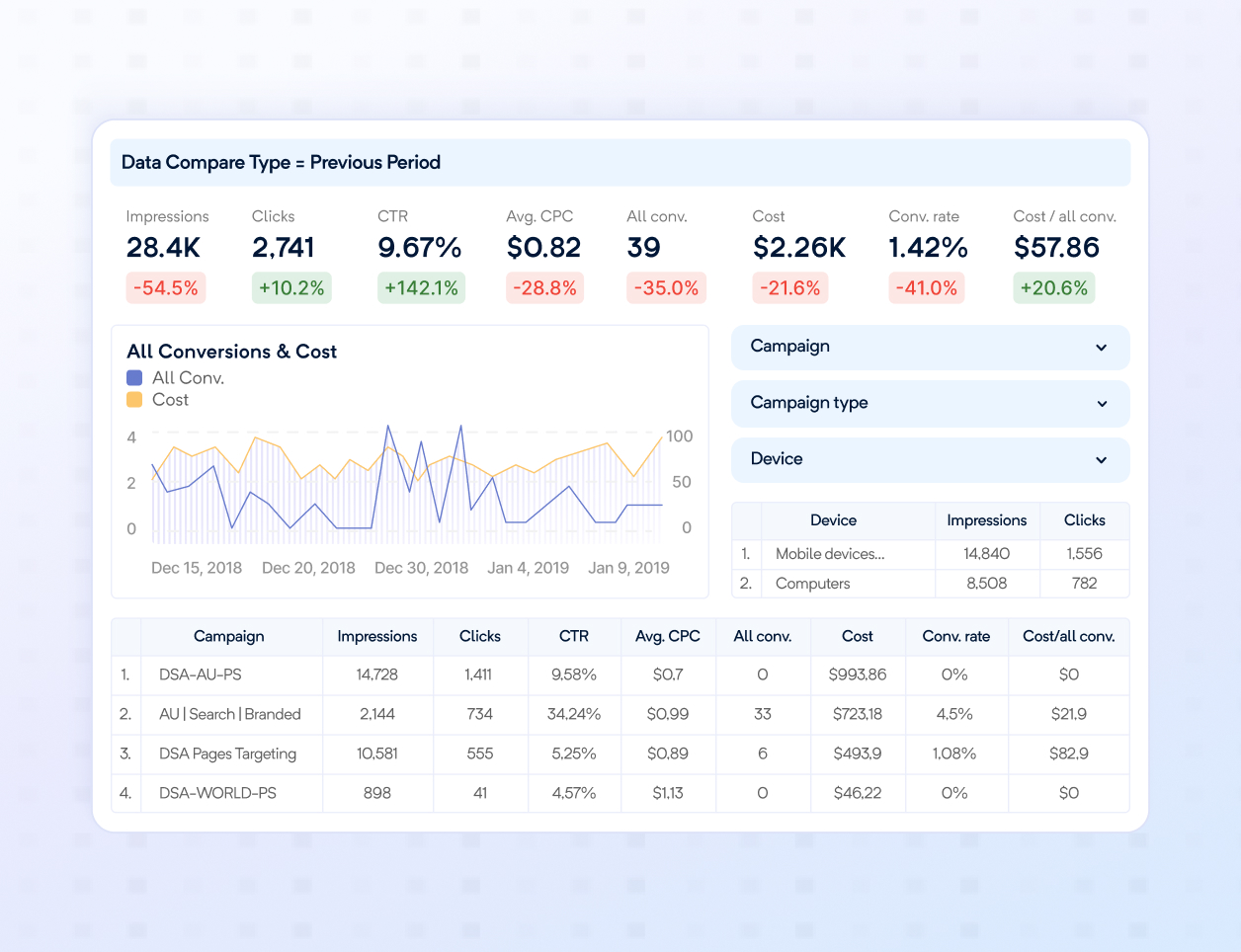 Spot irregularities before they become problems and uncover opportunities to reduce waste and increase conversions. When performance shifts, identify the root cause in seconds, so you can act fast and with confidence.